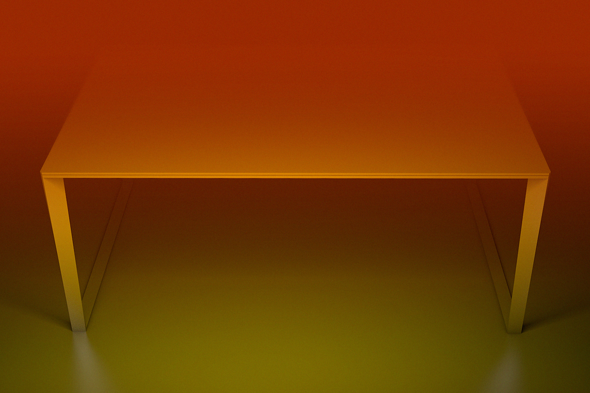 A simple dining table with a square surface and four legs. But with a twist. Literally. Made of laminated marine grade plywood and steel.